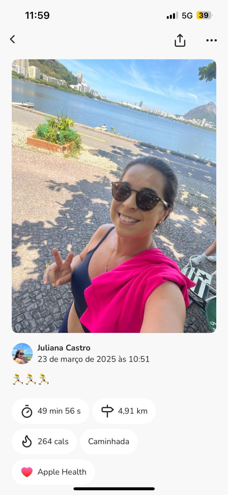 Juliana costuma encarar os desafios ao lado dos amigos e vê no app um verdadeiro motor do bem. Para ela, acompanhar a rotina ativa dos colegas na plataforma é como receber um empurrão carinhoso para não ficar parada.