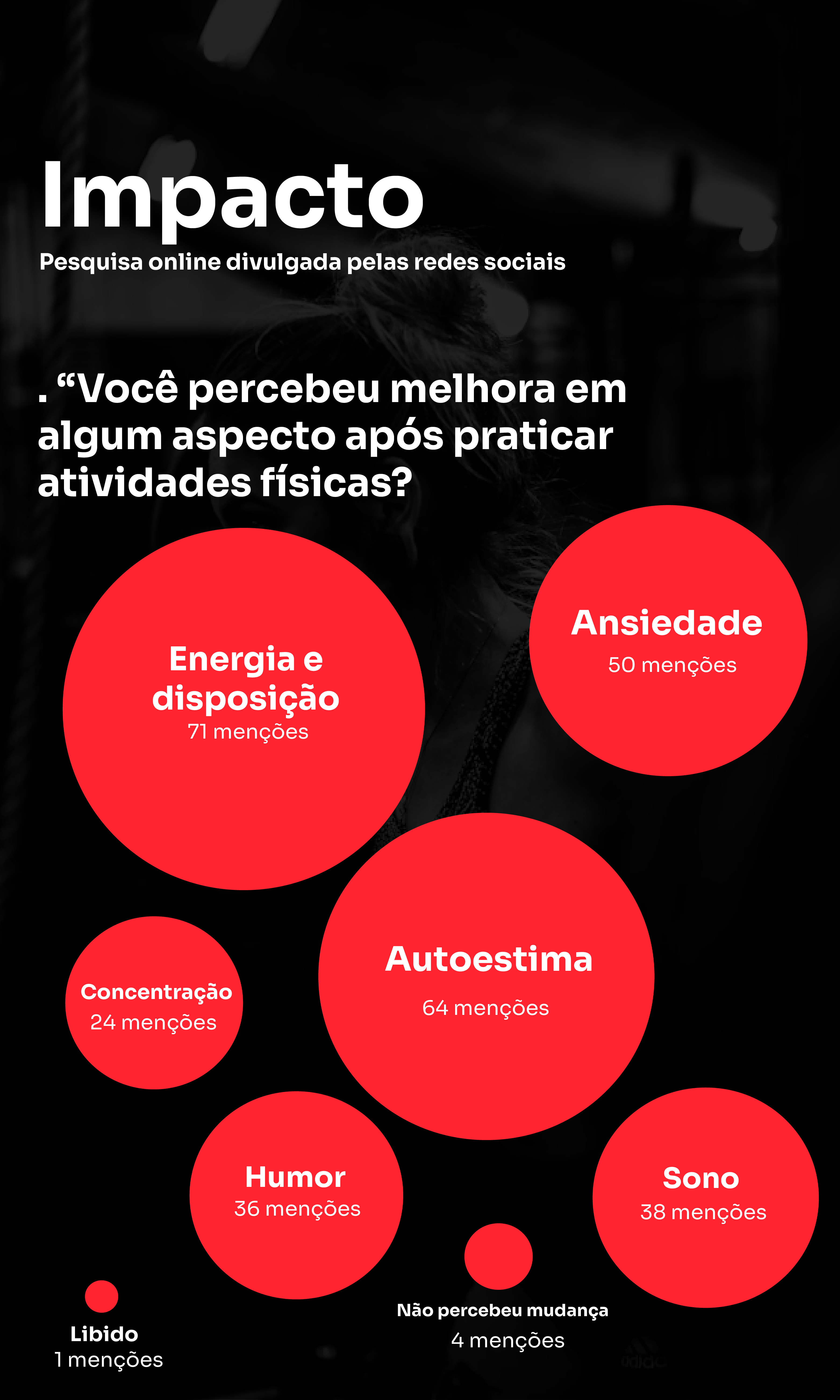 Mais do que promover o bem-estar físico, manter o corpo em movimento é também um remédio para a mente. Em nossa pesquisa, muitos participantes relataram grandes benefícios emocionais e psicológicos com a prática regular de atividades físicas. Energia e disposição, autoestima e ansiedade foram os principais percebidos na rotina, respectivamente.